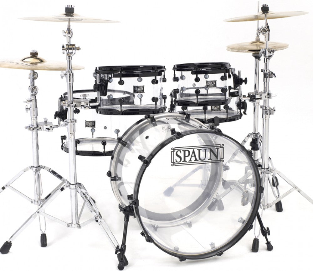 Shell Pack- 7x10 rack tom, 8x12 rack tom, 11x14 rack tom, 18x22 kick drum.  Clear Acrylic with Black Hardware. Features our SBR Solid Brass Resonator Lugs, Double 45 Degree Edges, SSS Mounts on Rack Toms, and 100% Acrylic Shells.