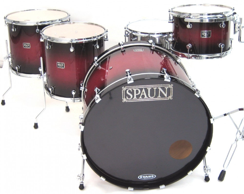 Shell Pack- 8x12 rack tom, 14x14 floor tom, 14x16 floor tom, 18x26 kick drum. Bordeaux Burst High Gloss Lacquer starts with our Bordeaux Stain in the center and bursts out to Piano Black at the edges. Chrome Hardware. Features our SBR Solid Brass Resonator Lugs, Double 45 Degree Edges, SSS Mounts on Rack Toms, and 100% Maple Shells.