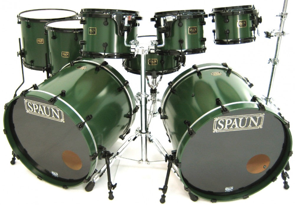 Shell Pack- 7x8 rack tom, 7x10 rack tom, 9x12 rack tom, 14x14 floor tom, 14x16 floor tom, two 18x22 kick drums. Army Green Satin Lacquer Finish with Black Hardware. Features our SBR Solid Brass Resonator Lugs, Double 45 Degree Edges, SSS Mounts on Rack Toms, and 100% Maple Shells.