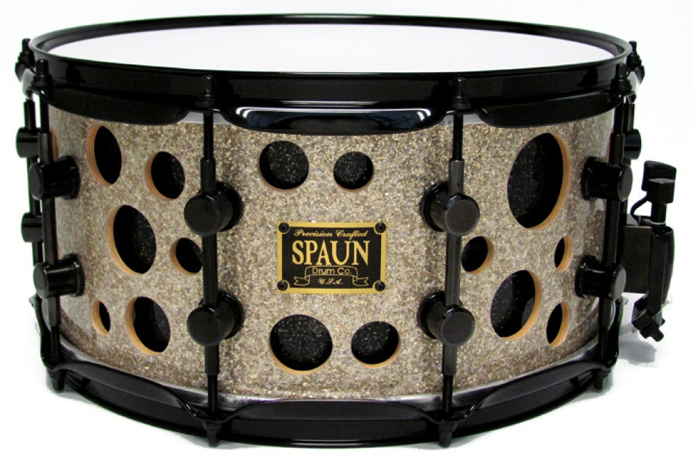 Features our Edgevent 100% Maple Shell with Swiss Cheese Vents, SBR Solid Brass Resonator Lugs, Double 45 Degree Bearing Edges, and Hyper-Sensitive Snare Bed. Silver Glass outer shell with Black Glass inner shell and Black Hardware.