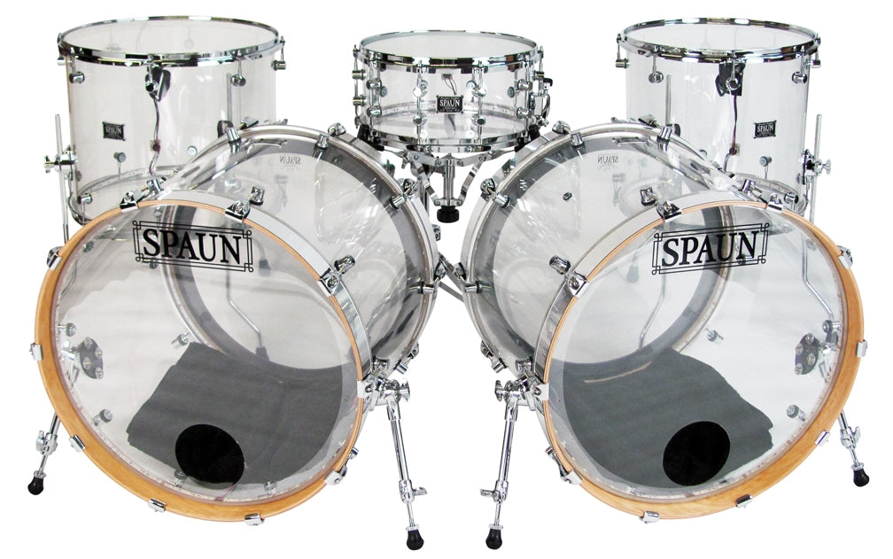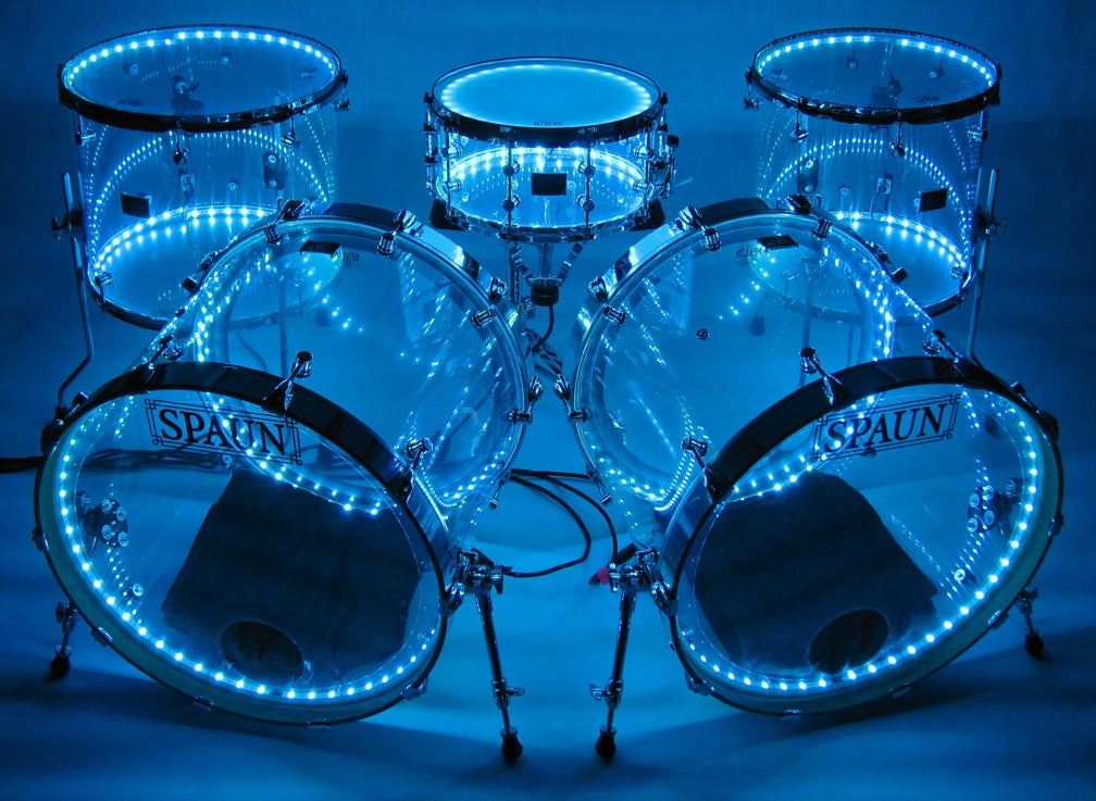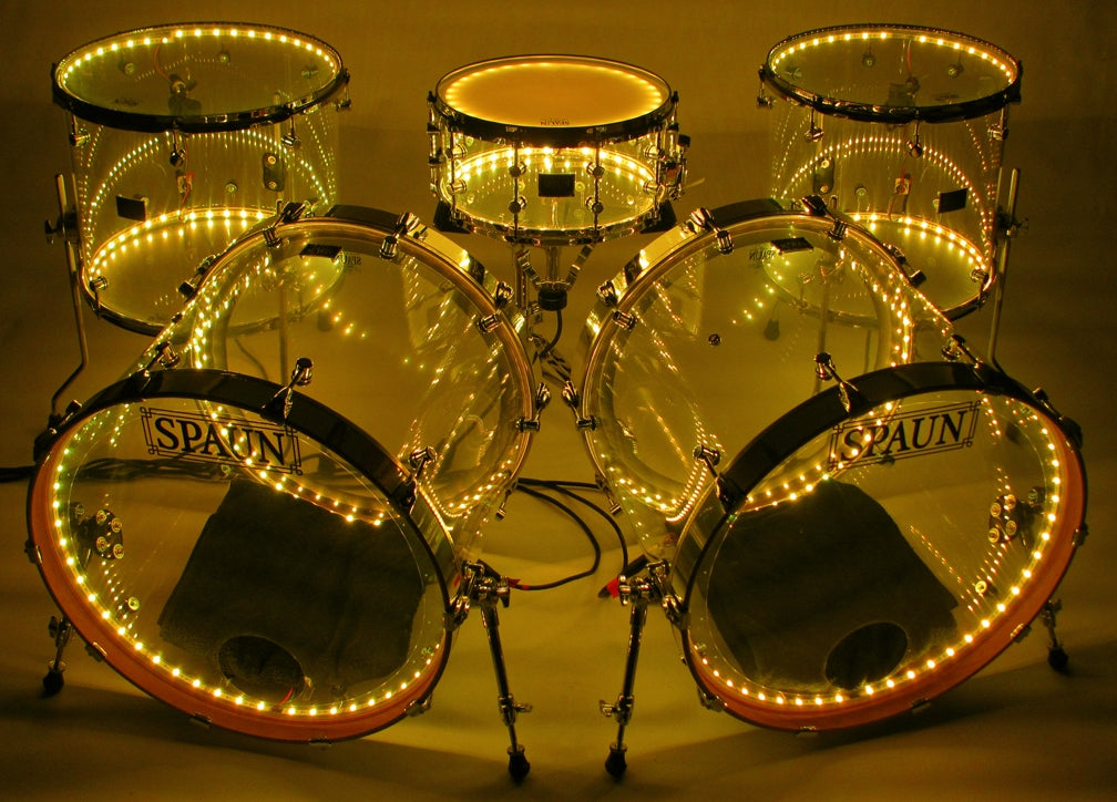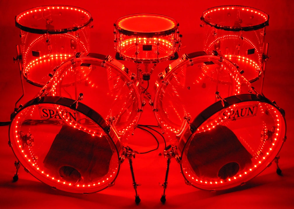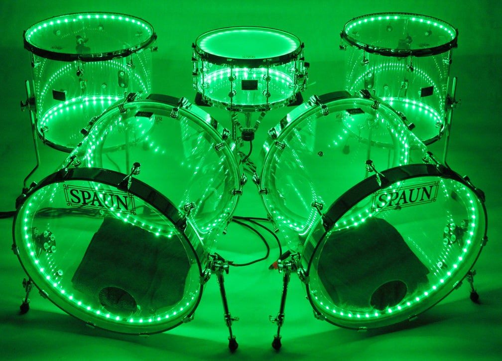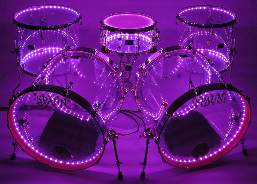 Shell Pack- 7x14 snare, 16x16 floor tom, 16x18 floor tom, and two 18x22 kick drums. Clear Acrylic Shells with Chrome Hardware. Features our SBR Solid Brass Resonator Lugs, Double 45 Degree Edges, and LED system installed. Comes complete with an 8-output controller rack, handheld (RF) radio frequency program selector with 24 various colors and patterns to choose from, plus a 10ft cable for each drum ordered. Expandable up to eight drums (larger kits can be built as well), Global DMX capability or Independent DMX capability can be added at additional costs. Custom built to match the power and plug types of most countries. 110v/240v power supply with USA plug is standard.