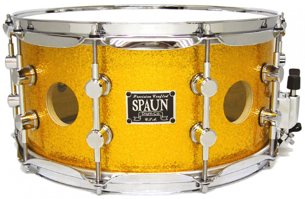 Features our 16-ply Maple Shell Vented, SBR Solid Brass Resonator Lugs, Double 45 Degree Edges, and Hyper-Sensitive Snare Bed. Gold Sparkle with Chrome Hardware.