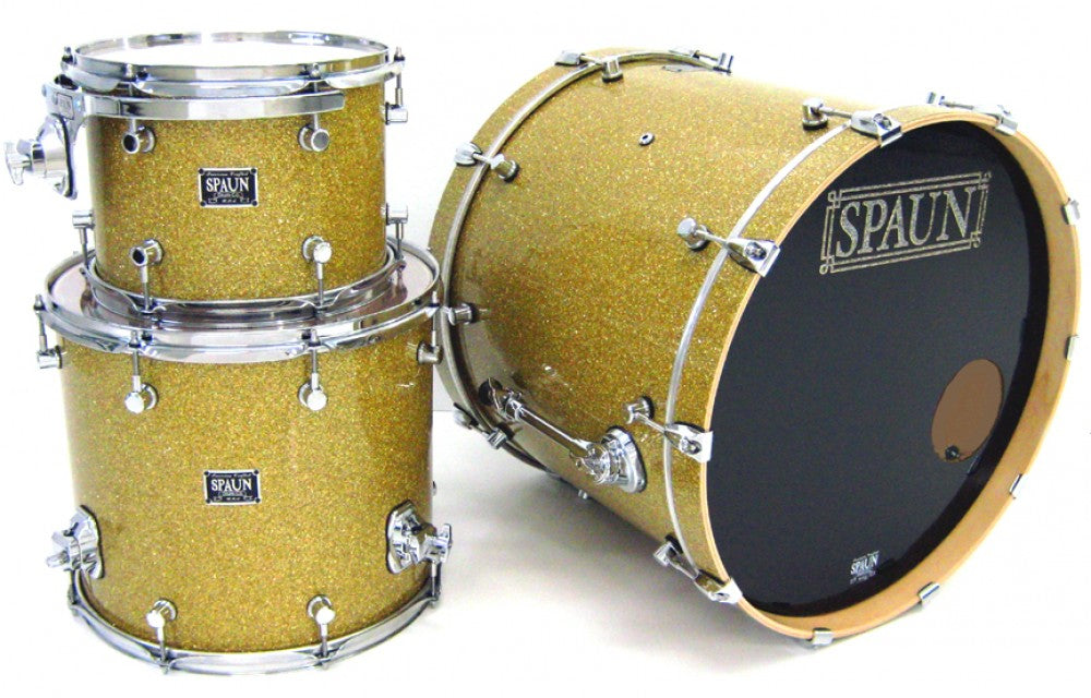 Shell Pack- 9x12 rack tom, 14x16 floor tom, 18x22 kick drum.  Tru Gold Glass with Chrome Hardware.  Features our SBR Solid Brass Resonator Lugs, Double 45 Degree Edges, SSS Mounts on Rack Toms, and 100% Maple Shells.