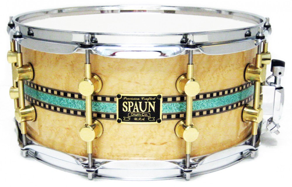 Features our 100% 8-ply Maple Shell, SBR Solid Brass Resonator Lugs, Double 45 Degree Bearing Edges, and Hyper-Sensitive Snare Bed. High Gloss Lacquer Finish with Turquoise Glass and Checkered Inlays. Brass Lugs and Chrome Hardware.