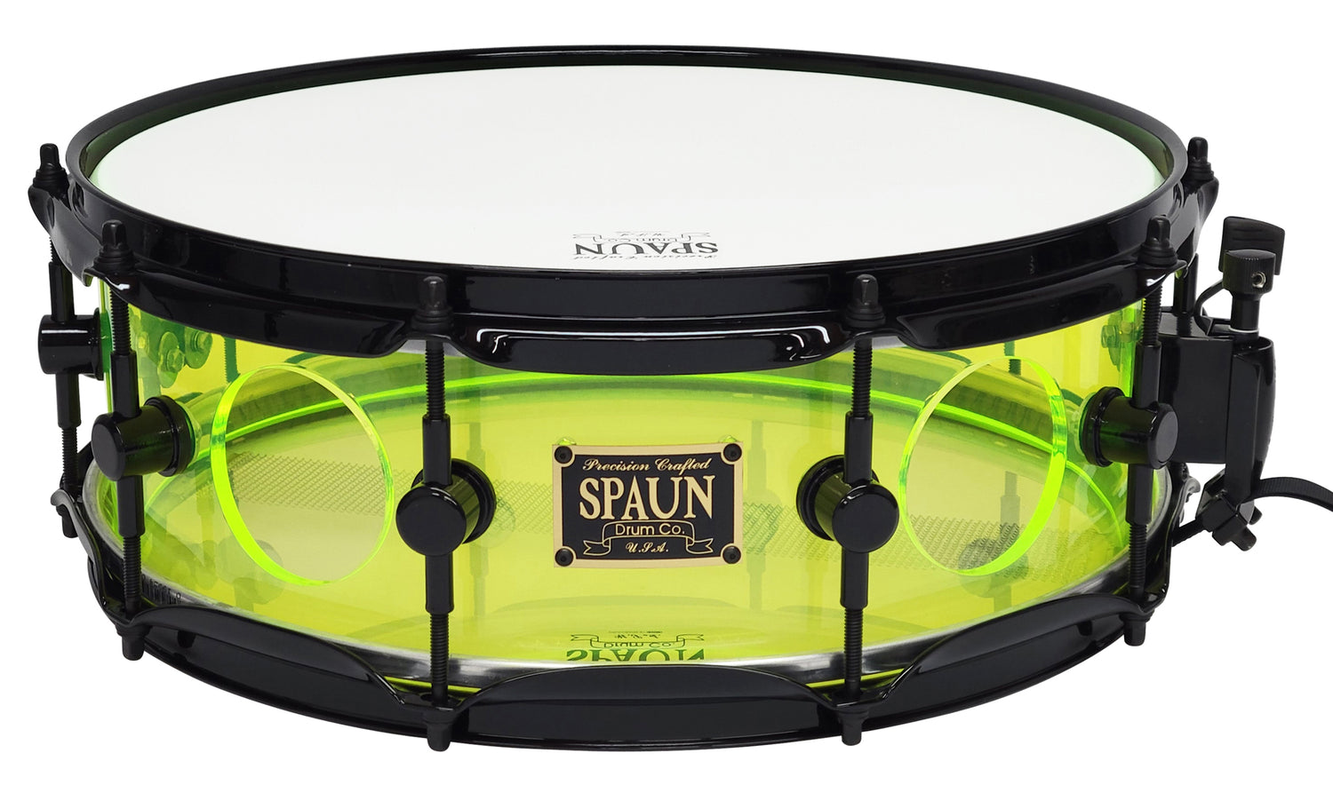 This killer Spaun snare features our Fluorescent Green Acrylic Shell with Two Vents, proprietary SBR Solid Brass Resonator Lugs, Double 45 Degree Edges, Hyper-Sensitive Snare Bed, and Black Hardware.
