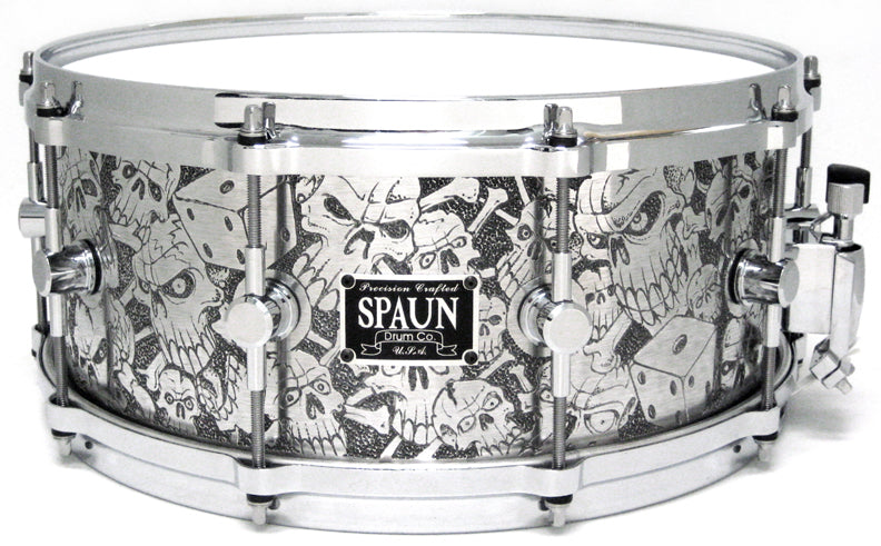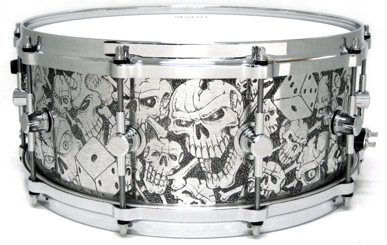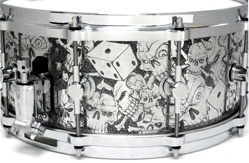 Features our 1/8" Thick Aluminum Shell, SBR Solid Brass Resonator Lugs, Rounded "Classic" Bearing Edges, and Hyper-Sensitive Snare Bed. Hand Engraved Skulls, Dice, and other cool graphics. Dozens of labor intensive hours go into creating this finish. Die Cast Hoops and Chrome Hardware.