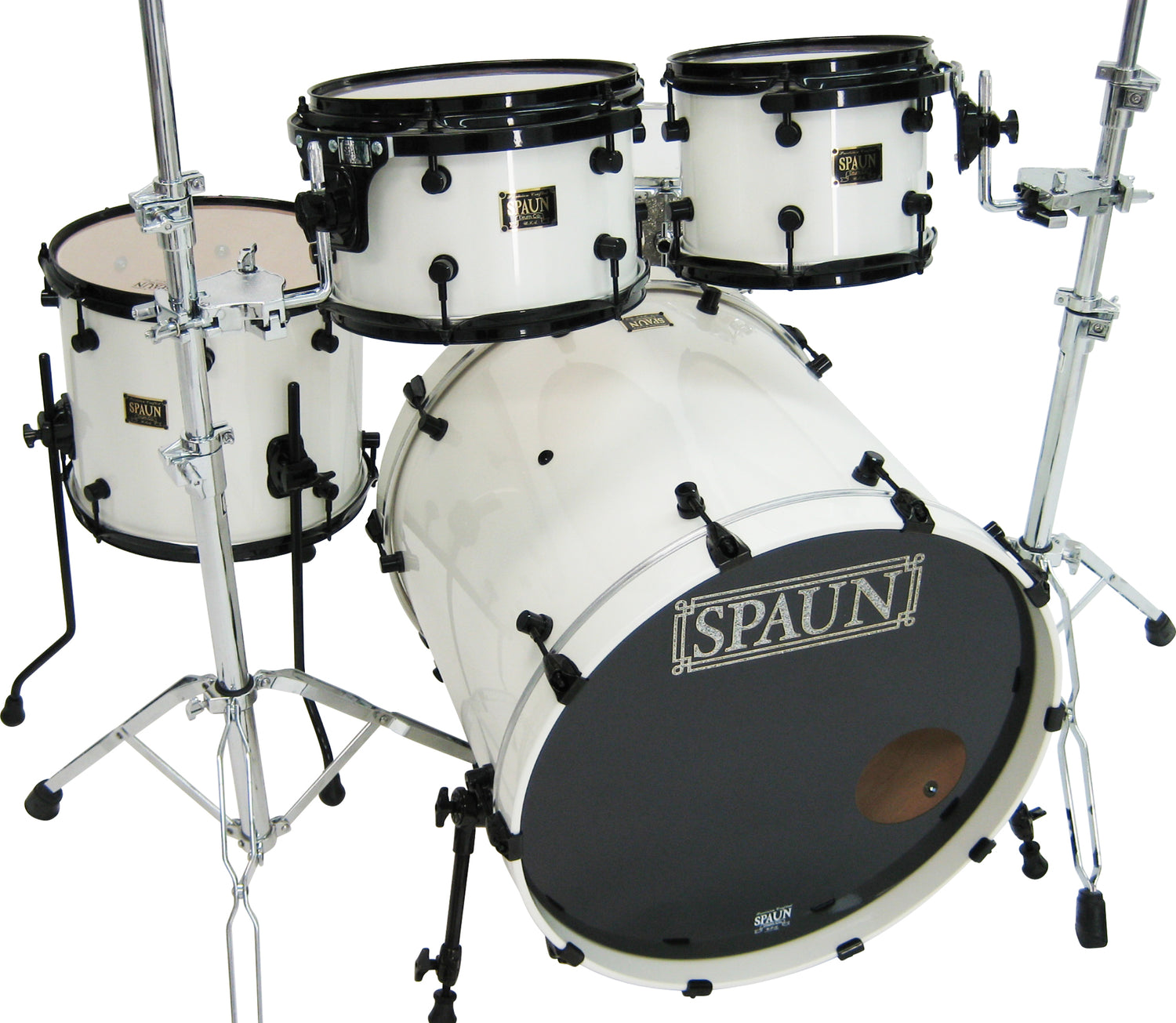 Shell Pack- 8x10 rack tom, 8x12 rack tom, 12x14 floor tom, 18x22 kick drum. Piano White high gloss lacquer finish with Black Hardware. Features our SBR Solid Brass Resonator Lugs, Double 45 Degree Edges, SSS Mounts on Rack Toms and 100% Maple Shells.