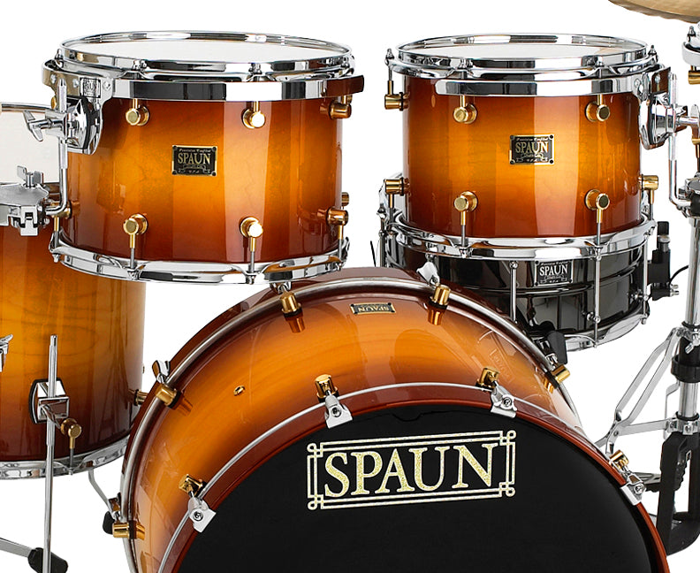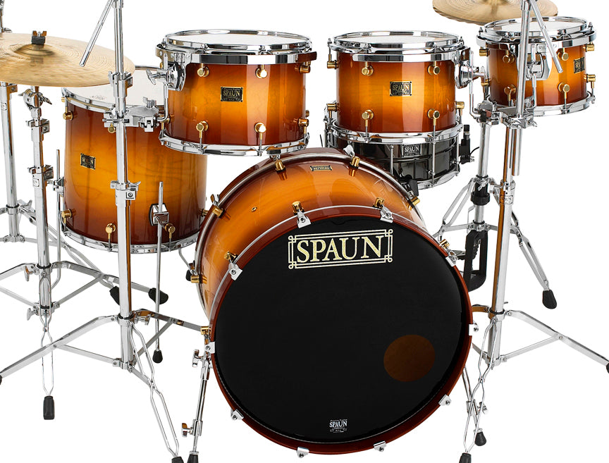 Shell Pack- 7x8 rack tom, 8x10 rack tom, 9x12 rack tom, 14x16 floor tom, 16x24 kick drum. Honeyburst high gloss lacquer finish with Brass Lugs and Chrome Hardware. Features our SBR Solid Brass Resonator Lugs, Double 45 Degree Edges, and 100% Maple Shells.