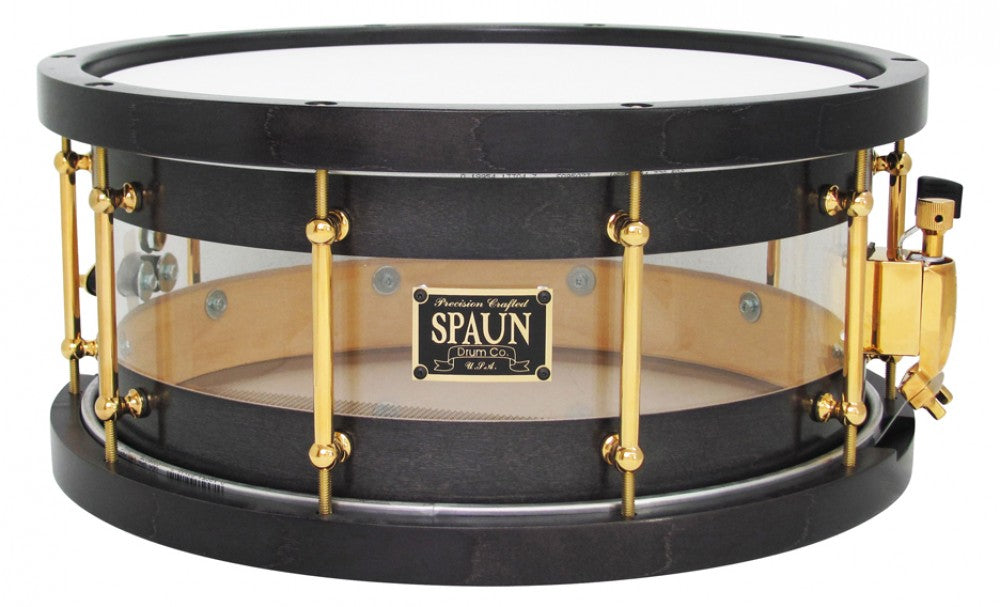 Features our 100% Maple & Acrylic Hybrid Shell, VTL Vintage Tube Lugs, Yamaha Style Wood Hoops, Double 45 Degree Bearing Edges, and Hyper-Sensitive Snare Bed. Black Satin Edges with Clear Center and Gold Hardware.