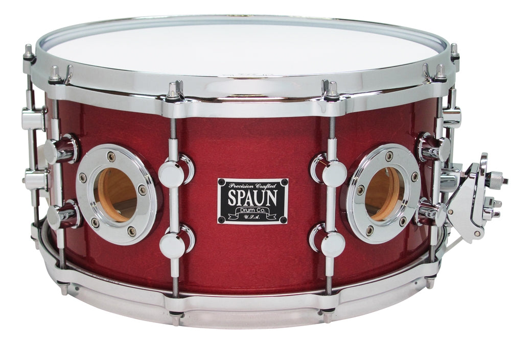 Features our 100% 24-ply Maple Shell with Four Reinforced Vents, SBR Solid Brass Resonator Lugs, Double 45 Degree Bearing Edges, and Hyper-Sensitive Snare Bed. Bordeaux Gloss Lacquer Finish with Die Cast Hoops and Chrome Hardware. Shown with optional DW throw off.