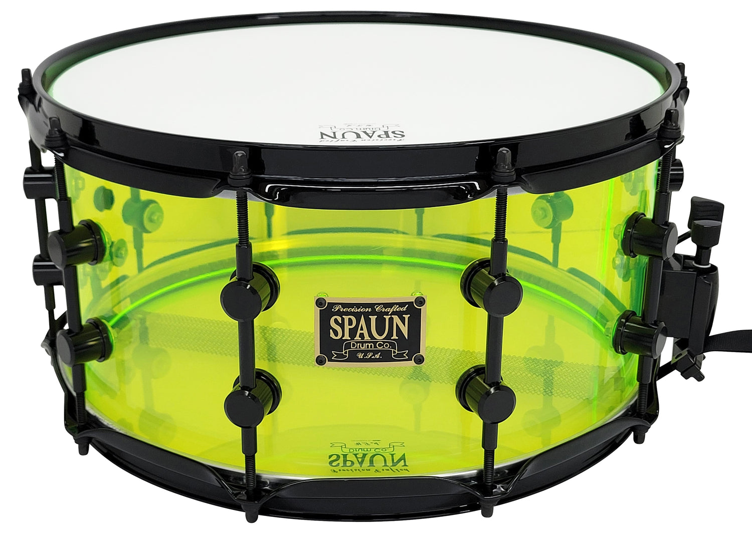 Features our 100% Acrylic Shell, SBR Solid Brass Resonator Lugs, Double 45 Degree Bearing Edges, and Hyper-Sensitive Snare Bed. Fluorescent Green with Black Hardware.