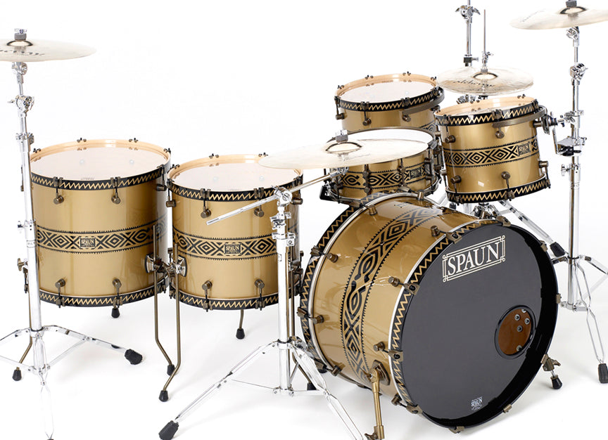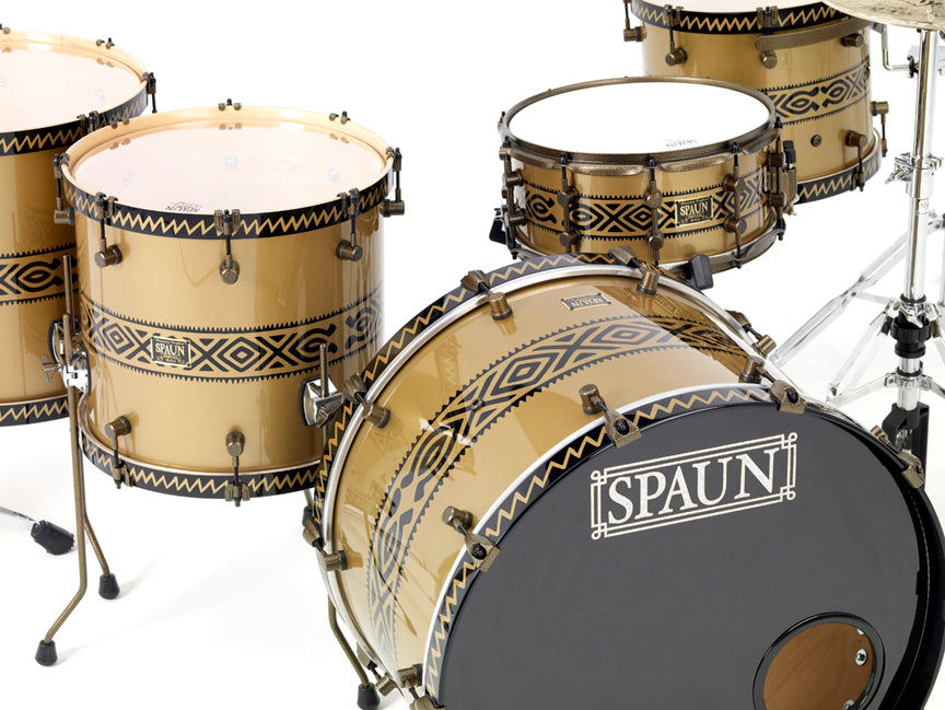 Shell Pack- 10x12 rack tom, 11x14 rack tom, 14x16 floor tom, 16x18 floor tom, 18x24 kick drum. Aztec Graphic in Black with Gold Metallic Base. Hardware is finished in Gold Vein. Features our SBR Solid Brass Resonator Lugs, Double 45 Degree Edges, Vintage Wood Hoops & Claws, and 100% Maple Shells.