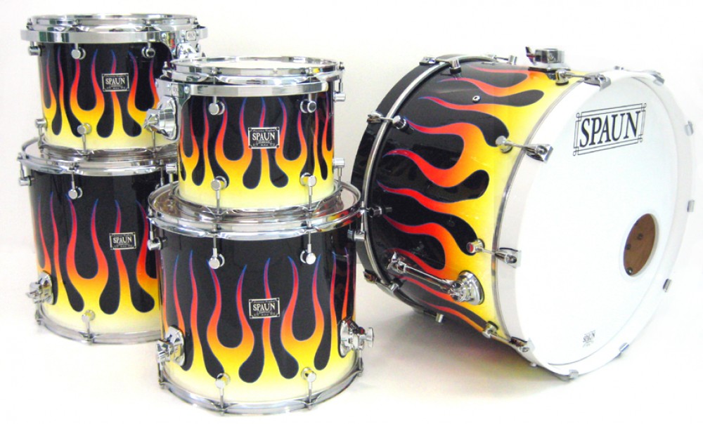 Shell Pack- 10x12 rack tom, 11x14 rack tom, 14x16 floor tom, 16x18 floor tom, 18x24 kick drum.  Classic Hot Rod Flame Lacquer Finish fades from White to Yellow to Orange to Red at the tips with Blue Pinstripe.  Chrome Hardware.  Features our SBR Solid Brass Resonator Lugs, Double 45 Degree Edges, SSS Mounts on the Rack Toms, and 100% Maple Shells.