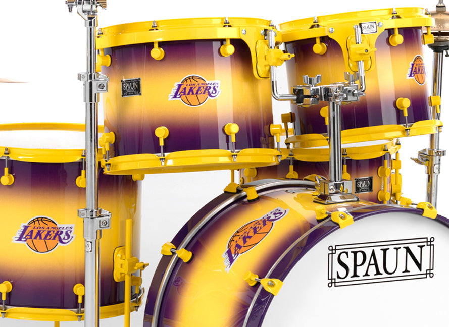 Shell Pack- 10x12 rack tom, 11x14 rack tom, 14x16 floor tom, 16x18 floor tom, 16x24 kick drum. Laker Gold High Gloss Lacquer Finish with Purple Burst. Laker decals and Yellow Hardware. Features our SBR Solid Brass Resonator Lugs, Double 45 Degree Edges, SSS Mounts on Rack Toms, and 100% Maple Shells.