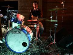 Shawn plays a Spaun Revolutionary Series Shell Kit - 9x13 rack tom, 14x16 floor tom, 14x24 kick drum in Blonde to Royal Fade and a Spaun 20th Anniversary 6.5x14 Brass Snare.