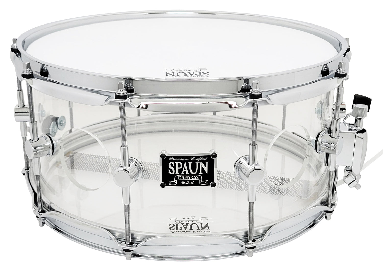 This killer Spaun snare features our Clear Acrylic Shell with Two Vents, proprietary SBR Solid Brass Resonator Lugs, Double 45 Degree Edges, Hyper-Sensitive Snare Bed, and Chrome Hardware.