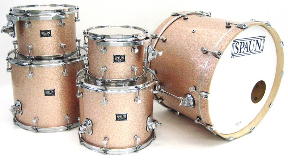 Shell Pack- 8x10 rack tom, 9x12 rack tom, 12x14 floor tom, 14x16 floor tom, 16x22 kick drum. Champagne Sparkle with Chrome Hardware.  Features our SBR Solid Brass Resonator Lugs, Double 45 Degree Edges, SSS Mounts on Rack Toms, and 100% Maple Shells.