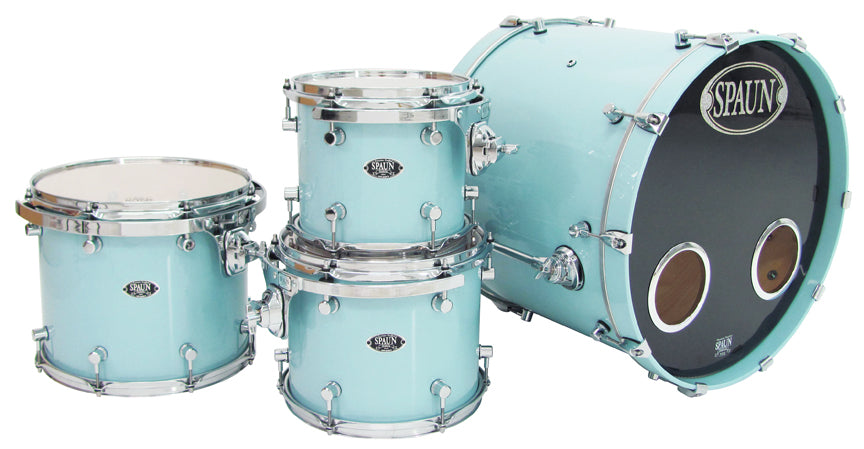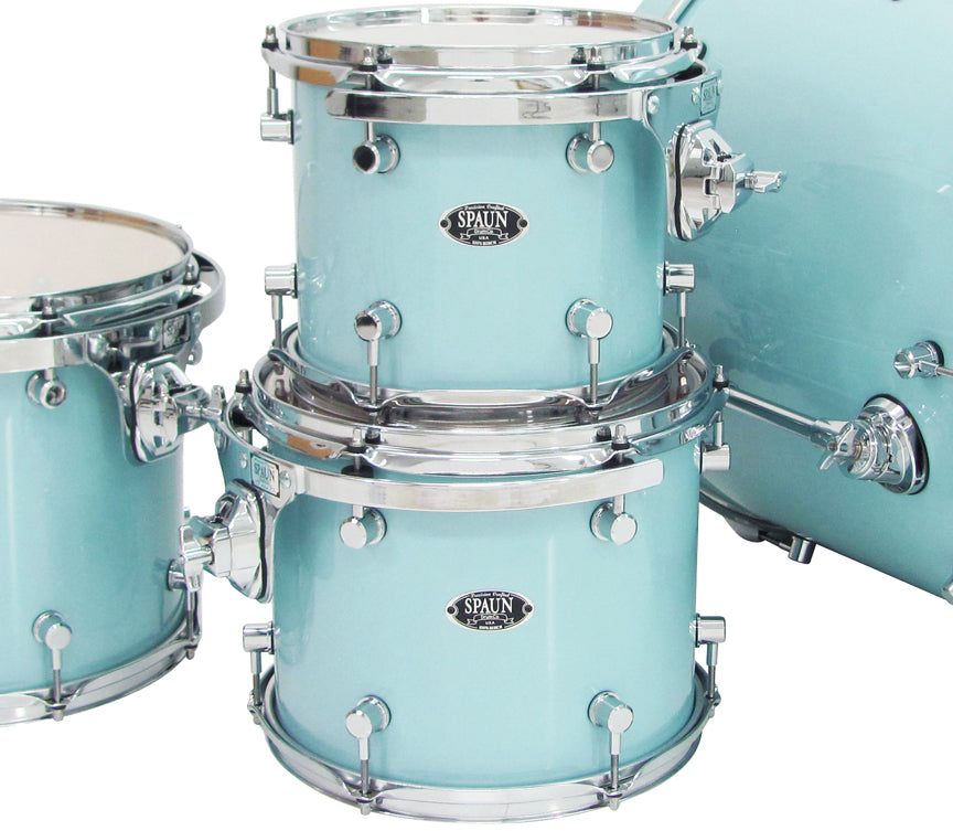 Shell Pack- 9x10 rack tom, 10x12 rack tom, 12x14 rack tom, 18x22 kick drum. Baby Blue High Gloss Lacquer Finish with Chrome Hardware. Features our proprietary SBR Solid Brass Resonator Lugs, Double 45 Degree Edges, SSS Mounts on Rack Toms, and 100% Birch Shells.