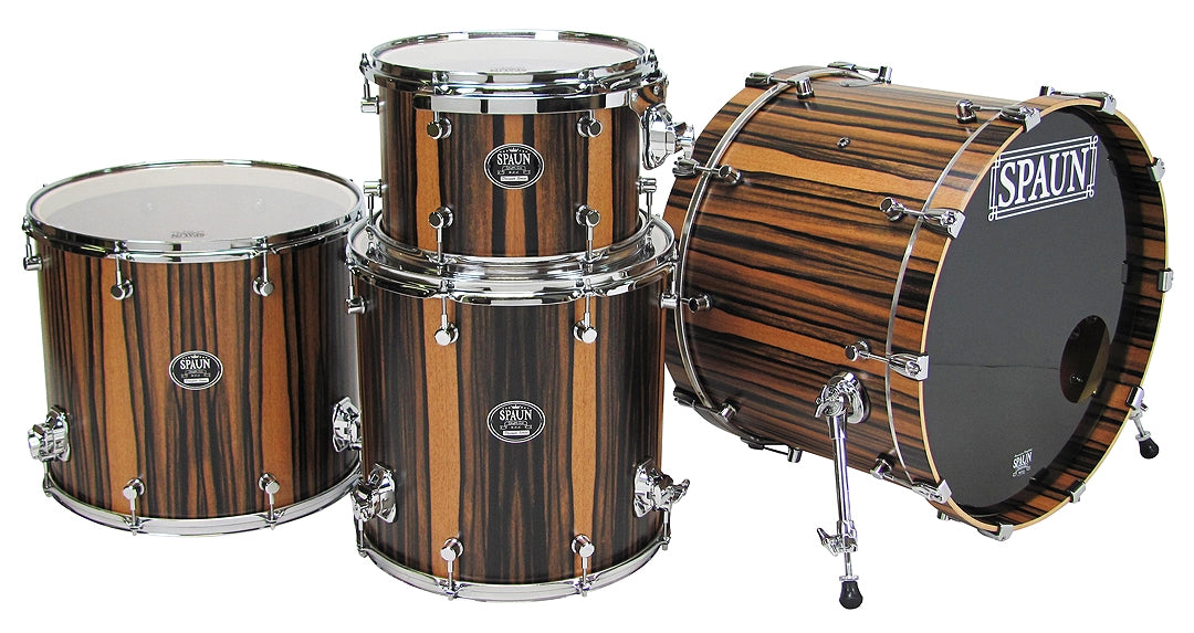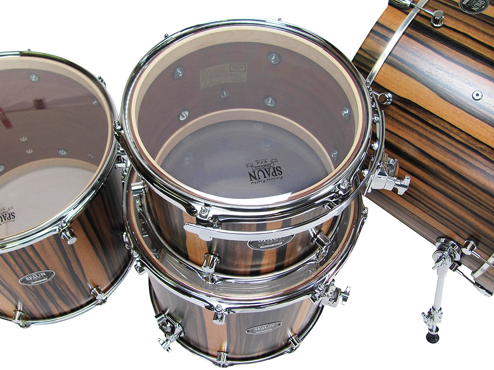 Shell Pack- 10x13 rack tom, 16x16 floor tom, 16x18 floor tom, 16x22 kick drum. Beautiful Exotic Ebony Ivory with Natural Satin Lacquer with Chrome Hardware. Features our proprietary SBR Solid Brass Resonator Lugs, Classic Rounded Bearing Edges, SSS Mounts on Rack Toms.