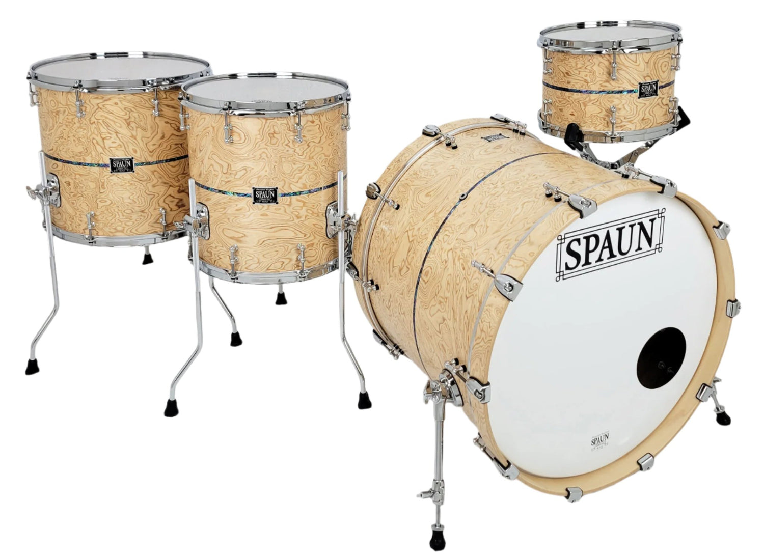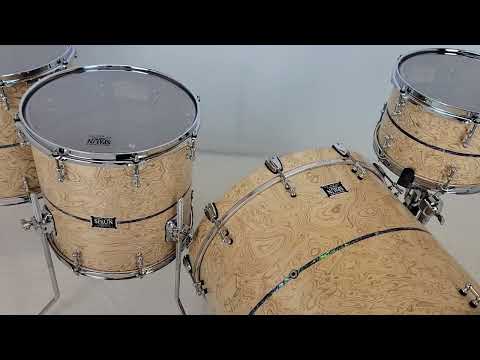 Shell Pack- 8x12 rack tom, 14x14 floor tom, 14x16 floor tom, 18x22 kick drum. This amazing walnut kit has a beautiful Olive Ash Burl face with Abalone Inlays. Natural Satin Lacquer Finish with Chrome Hardware. Features our Vintage Tube Lugs and proprietary Double 45 Degree Bearing Edges.