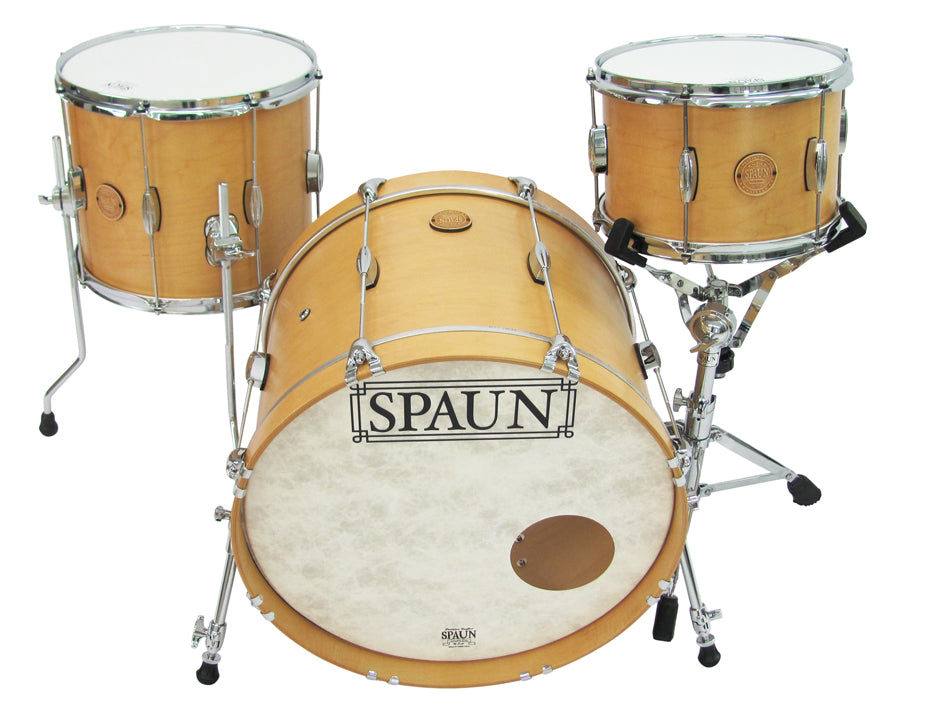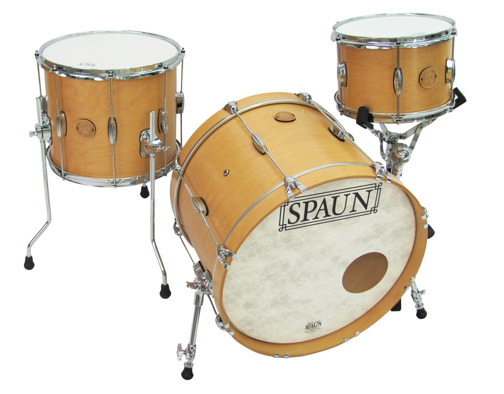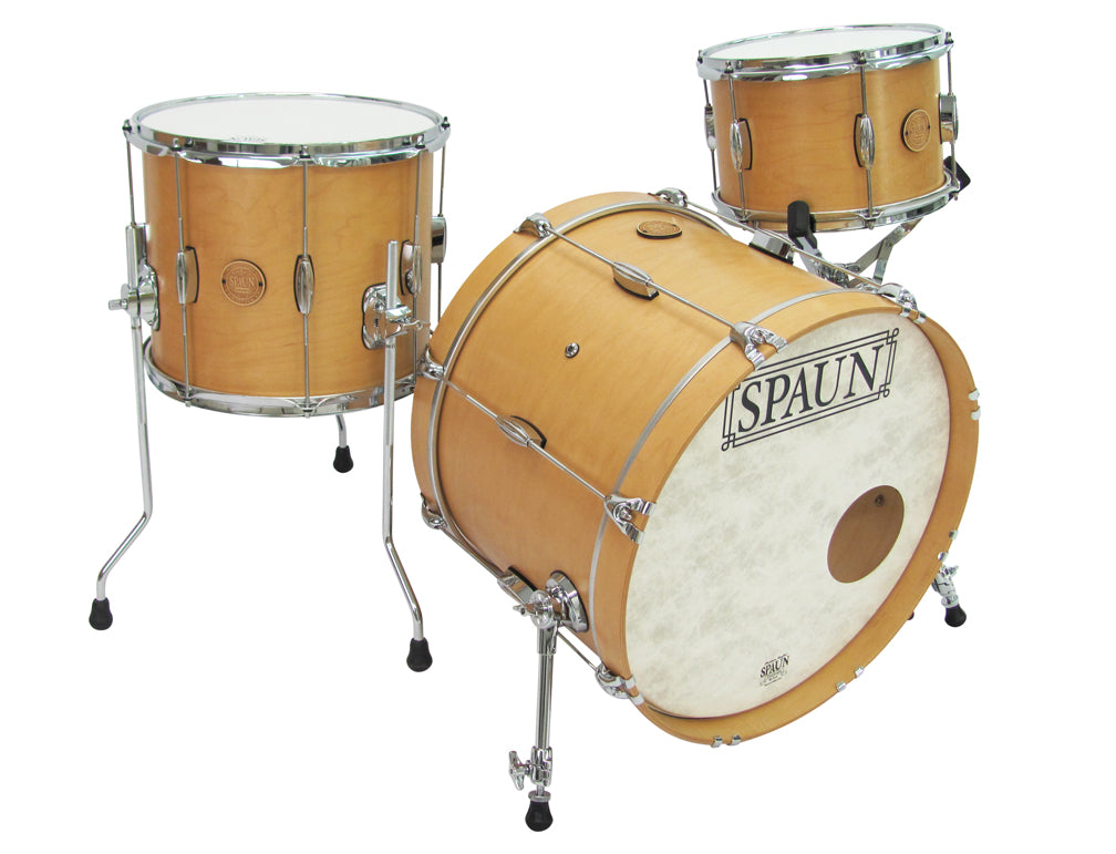 Shell Pack- 8x12 rack tom, 12x14 floor tom, 14x20 kick drum. Aged Maple Satin Lacquer Finish with Chrome Hardware.