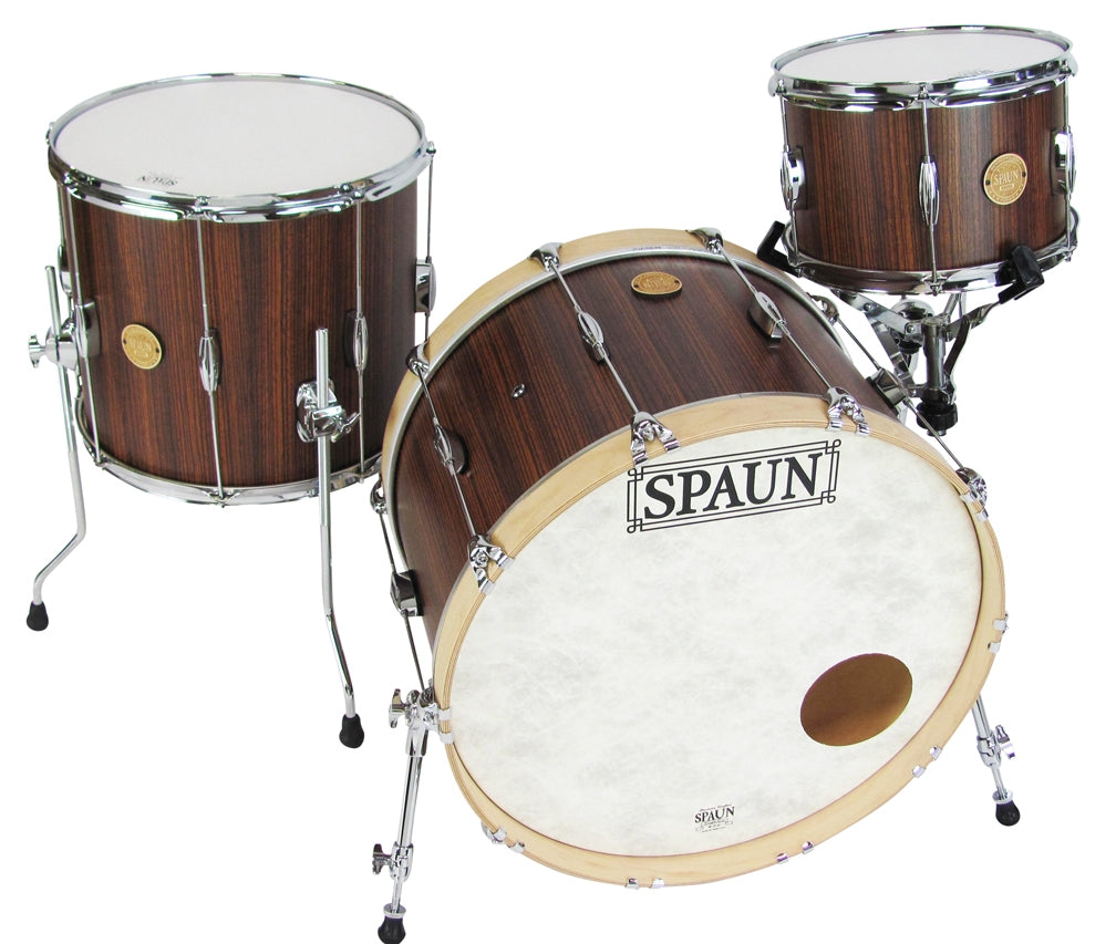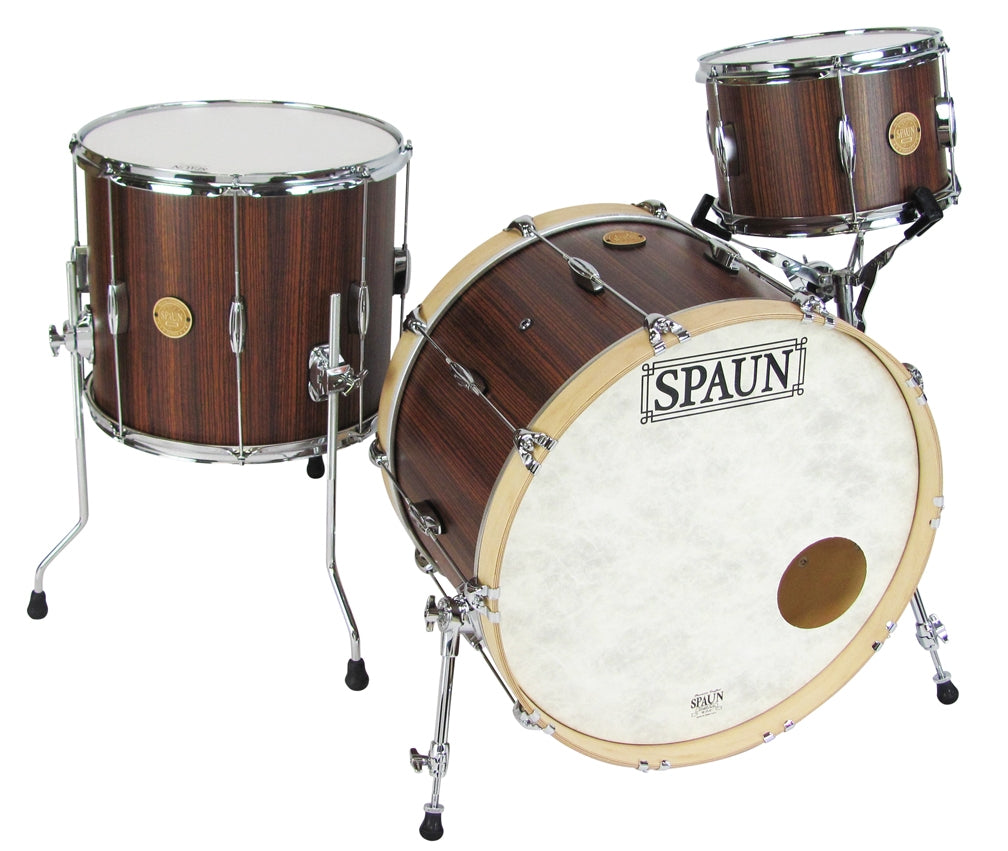 Shell Pack- 8x12 rack tom, 14x16 floor tom, 14x22 kick drum. Vertical Caramel Zebrawood Finish with Chrome Hardware.