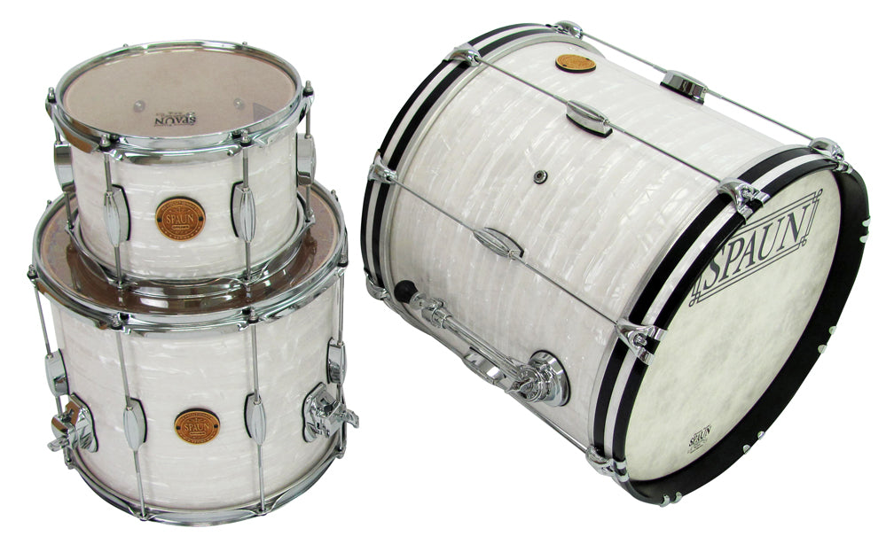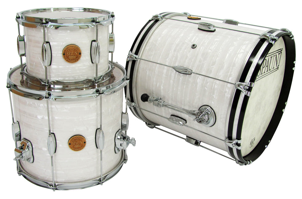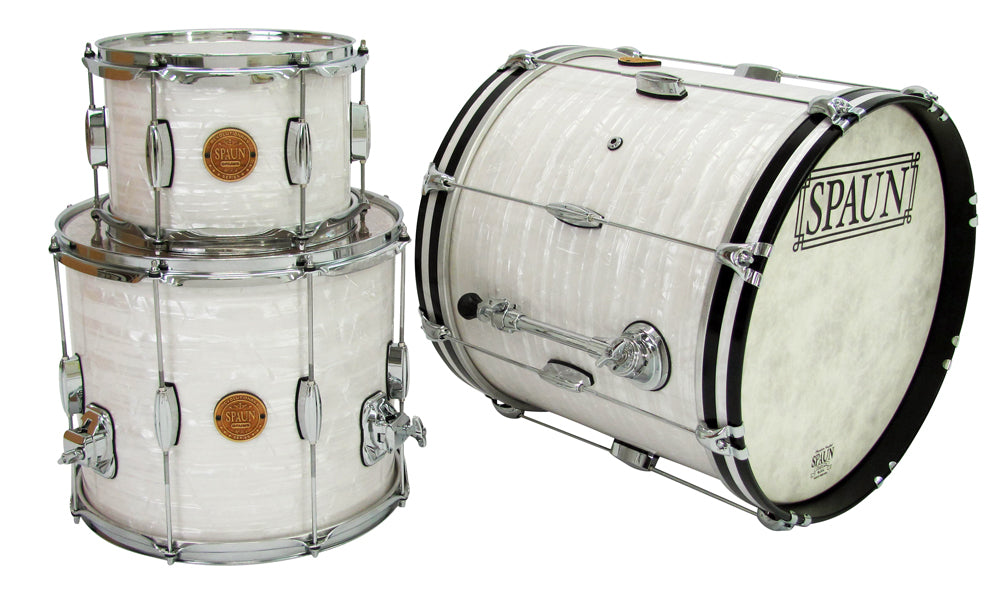 Shell Pack- 8x10 rack tom, 12x14 floor tom, 16x16 kick drum. White Marine with Black Bass Drum Hoops and Matching Inlays. Chrome Hardware.