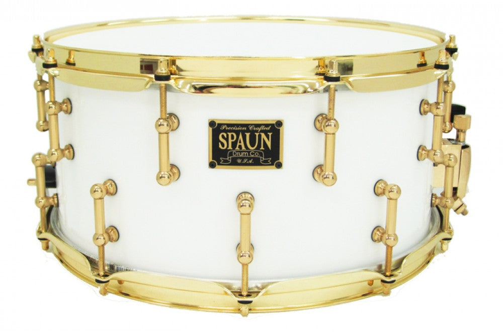 Features our 100% Acrylic Shell, Off Set VTL Vintage Tube Lugs, Double 45 Degree Bearing Edges, and Hyper-Sensitive Snare Bed. White Acrylic with Brass Hardware.