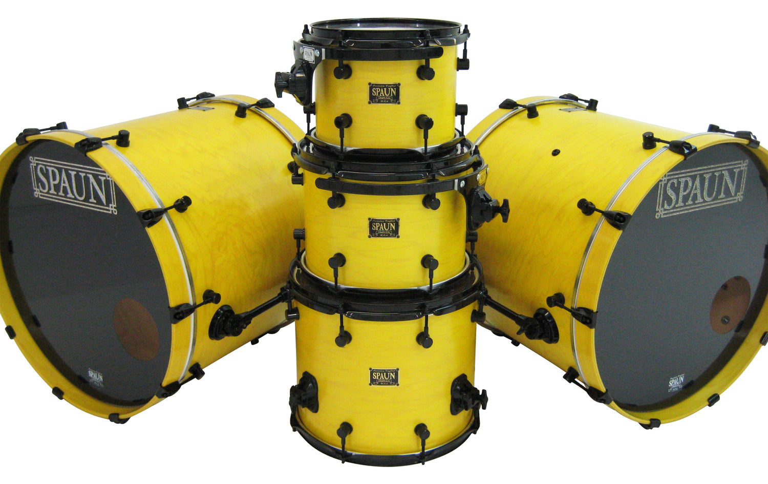 Double Bass Shell Pack- 8x10 rack tom, 9x12 rack tom, 14x16 floor tom, and two 18x22 kick drums. Featuring a brilliant Canary Yellow Satin Lacquer Finish with Black Hardware. Features our SBR Solid Brass Resonator Lugs, Double 45 Degree Edges, SSS Mounts on Rack Toms, and 100% Maple Shells.