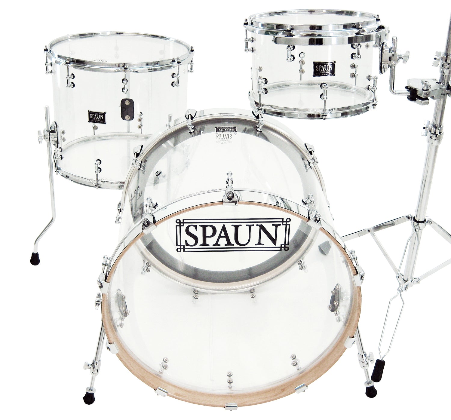 Shell Pack- 8x12 rack tom, 14x16 floor tom, 18x22 kick drum. Clear Acrylic with Off Set Lugs and Chrome Hardware. Features our VTL Vintage Tube Lugs, Double 45 Degree Edges, SSS Mounts on Rack Toms, and 100% Acrylic Shells.