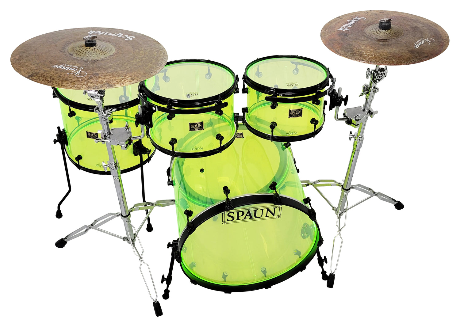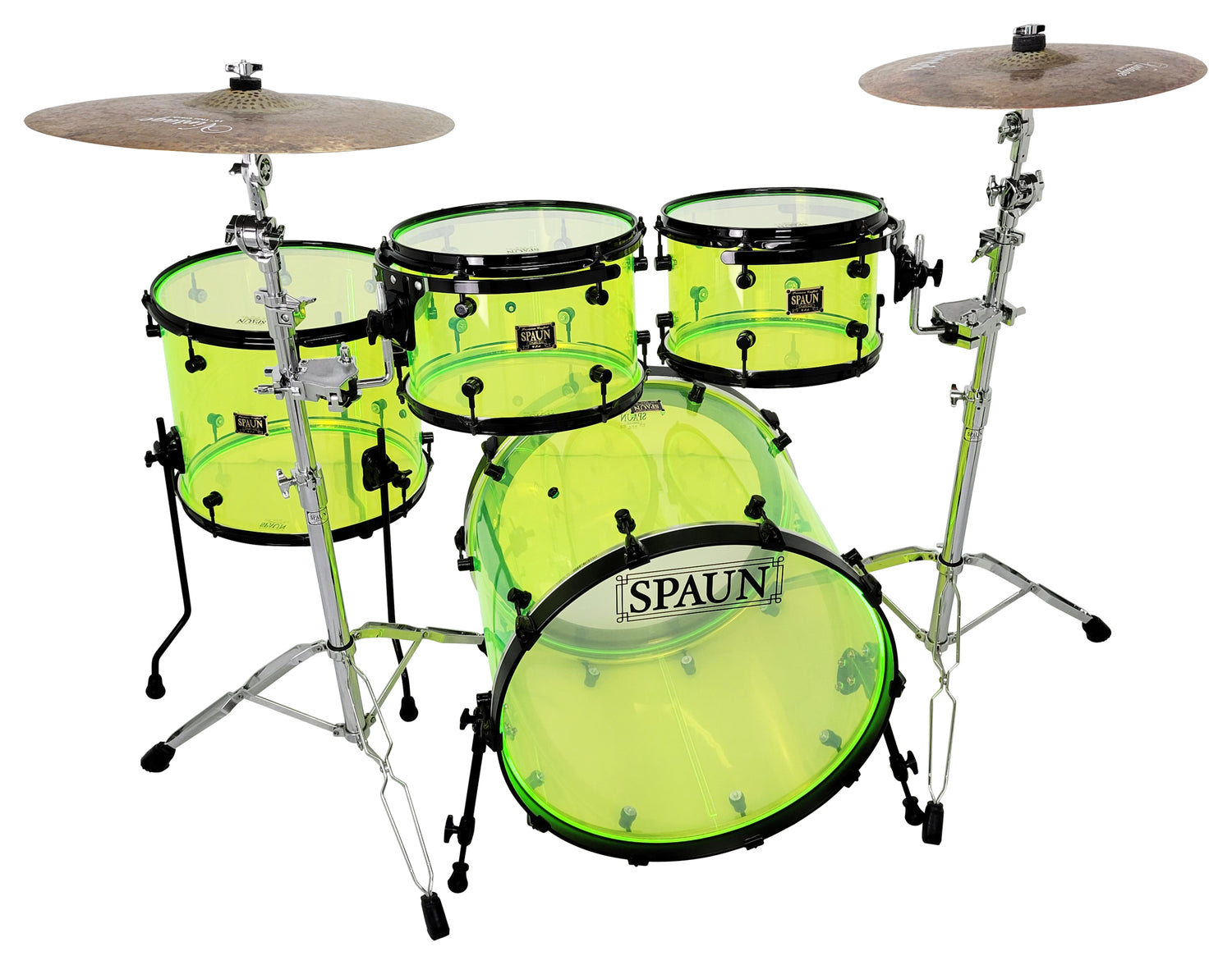 Shell Pack- 8x10 rack tom, 9x12 rack tom, 14x16 floor tom, 18x22 kick drum. Fluorescent Green Acrylic with Black Hardware. Features our SBR Solid Brass Resonator Lugs, Double 45 Degree Edges, SSS Mounts on Rack Toms, and 100% Acrylic Shells.