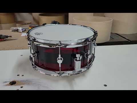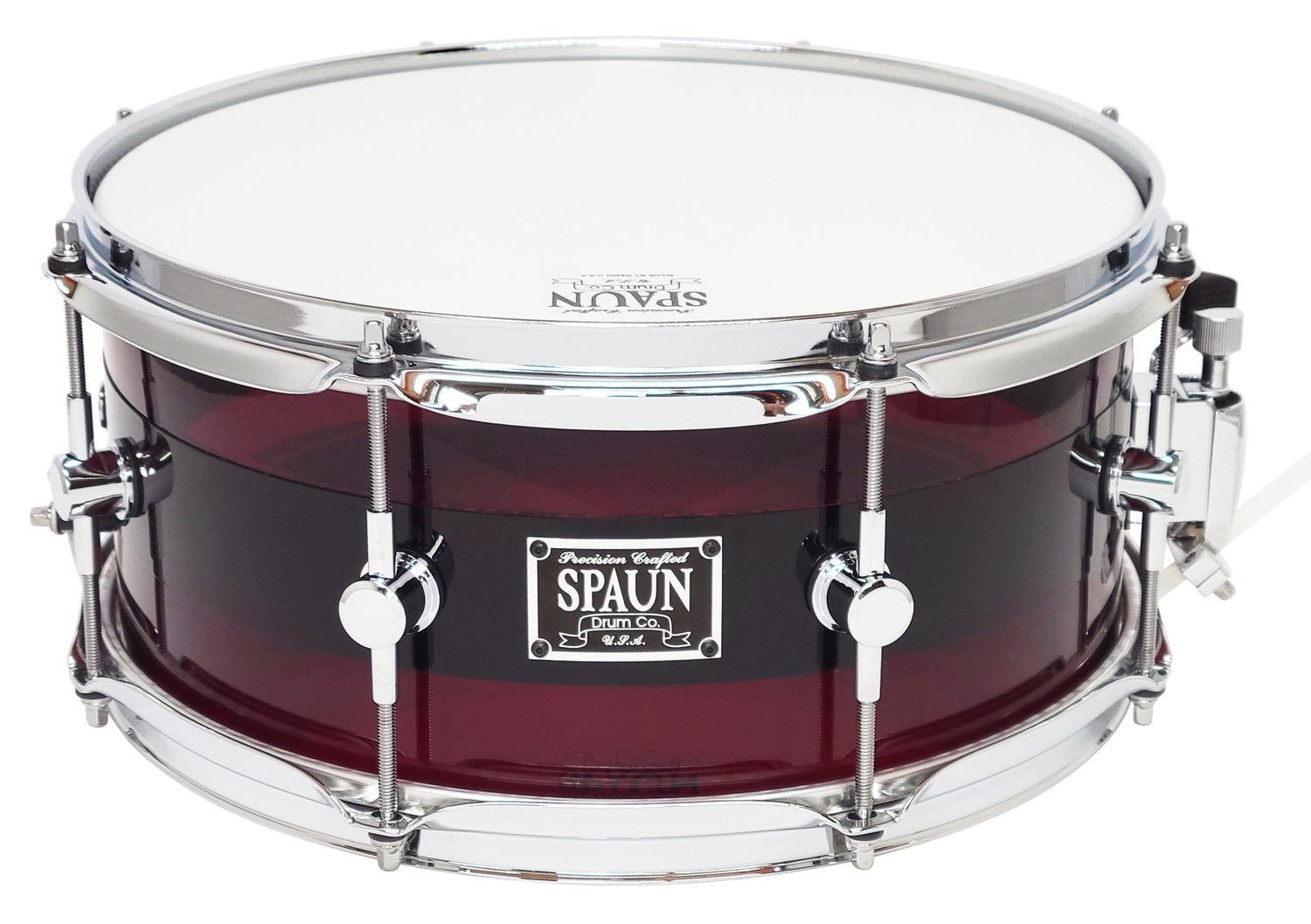 Here's a cool Spaun 6x13 Acrylic snare drum for you in Transparent Red with a Black Stripe. Featuring our SBR Solid Brass Resonator Lugs, Double 45 Degree Edges, Hyper-Sensitive Snare Bed, 100% Acrylic Shell, and Chrome Hardware.