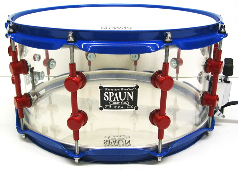 Features our SBR Solid Brass Resonator Lugs, Double 45 Degree Edges, Hyper-Sensitive Snare Bed, 100% Acrylic Shell, Clear with Red & Blue Hardware.