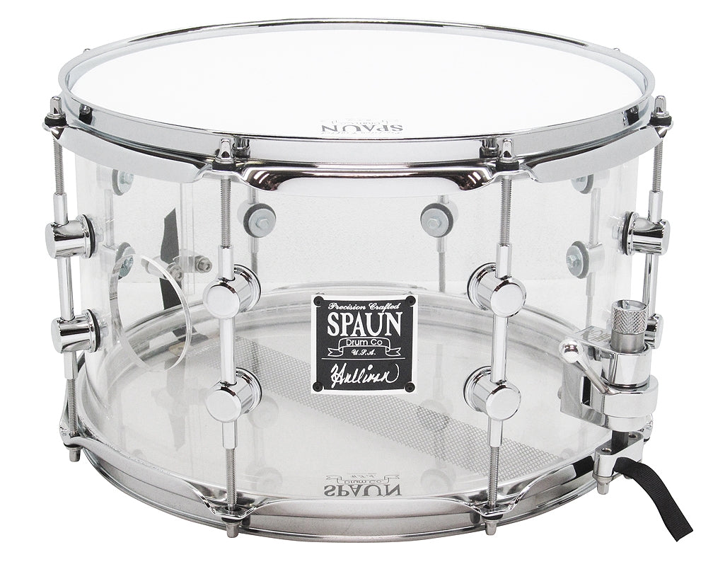 Features our 100% Acrylic Shell, SBR Solid Brass Resonater Lugs, Double 45 Degree Bearing Edges, Single 2.5" Vent, and Hyper-Sensitive Snare Bed. Clear with Chrome Hardware.