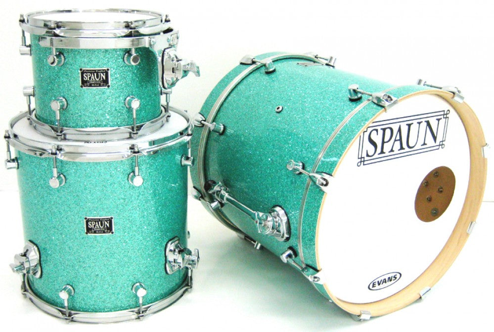 Shell Pack- 8x10 rack tom, 14x14 floor tom, 18x20 kick drum. Turquoise Glass with Chrome Hardware. Features our SBR Solid Brass Resonator Lugs, Double 45 Degree Edges, SSS Mounts on Rack Toms, and 100% Maple Shells.