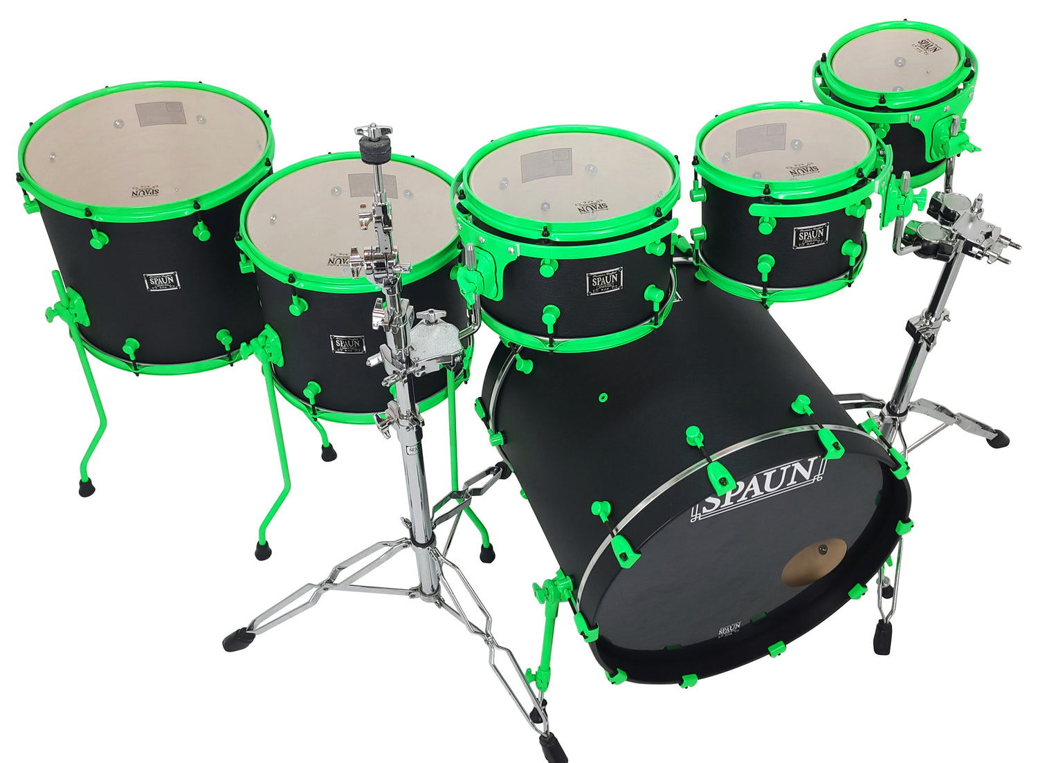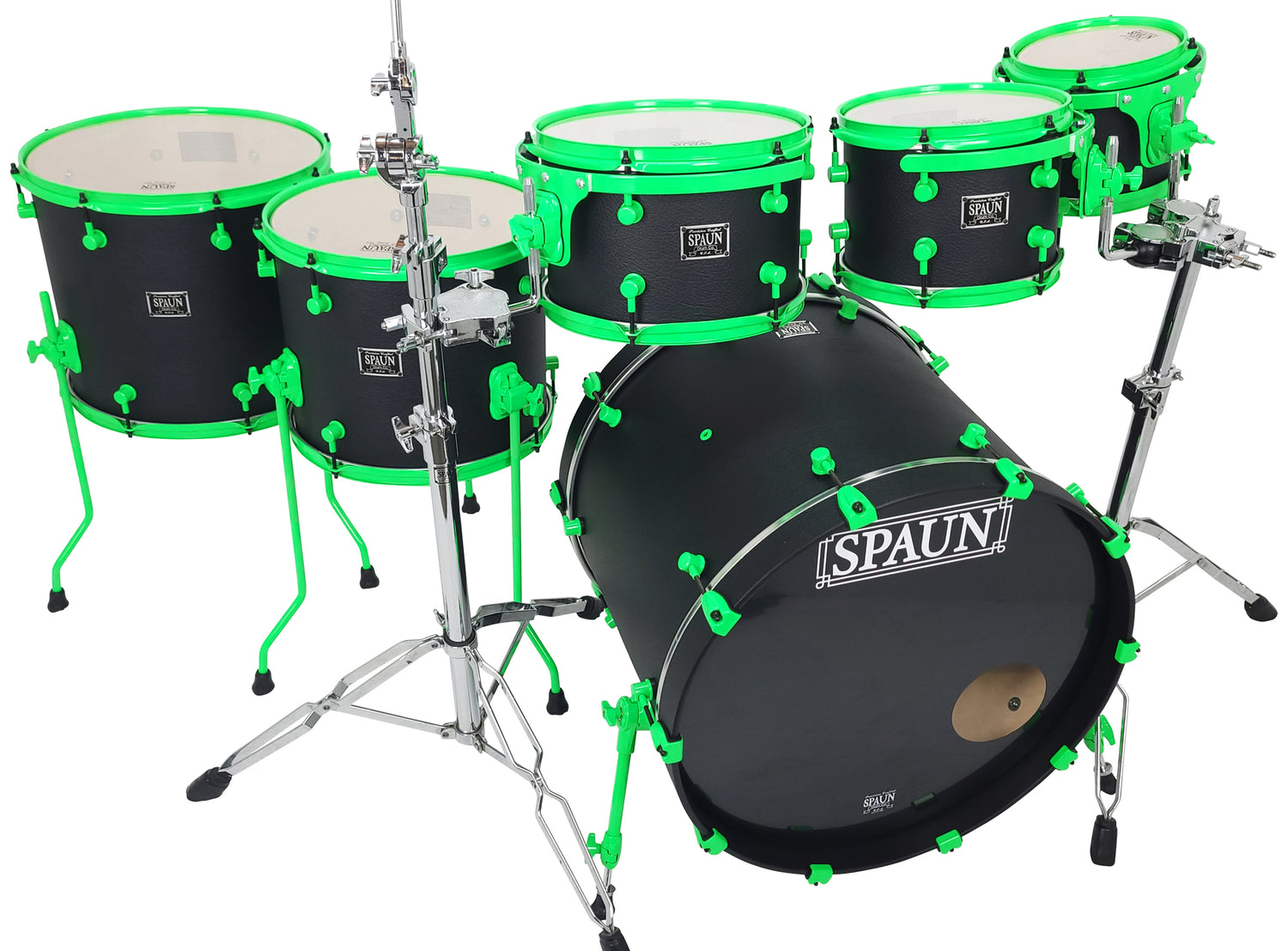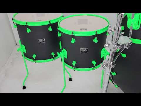 Shell Pack- 7x8 rack tom, 7.5x10 rack tom, 8x12 rack tom, 12x14 floor tom, 14x16 floor tom, and 18x22 kick drum. Black Tolex Finish with brilliant Neon Green Hardware. Features our proprietary SBR Solid Brass Resonator Lugs, Double 45 Degree Edges, SSS Mounts on Rack Toms, and 100% Maple Shells.