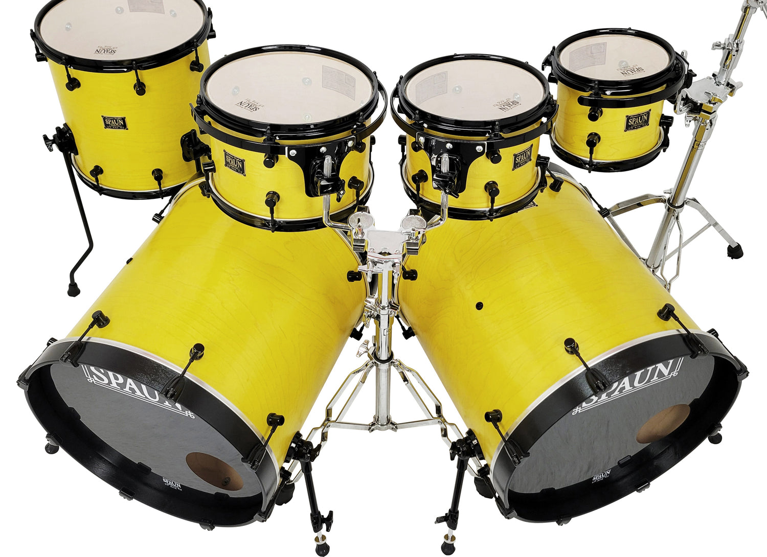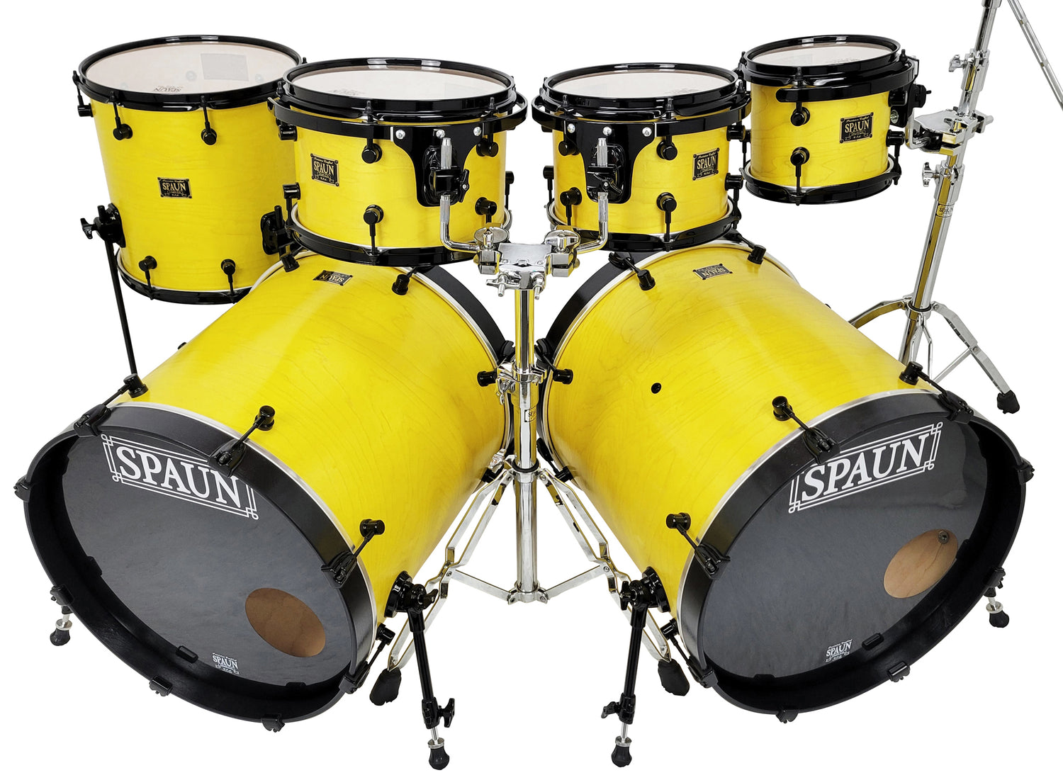 Double Bass Shell Pack- 7x8 rack tom, 8x10 rack tom, 9x12 rack tom, 14x14 floor tom, and two 20x20 kick drums. Featuring a brilliant Canary Yellow Satin Lacquer Finish with Black Hardware. Features our SBR Solid Brass Resonator Lugs, Double 45 Degree Edges, SSS Mounts on Rack Toms, and 100% Maple Shells.