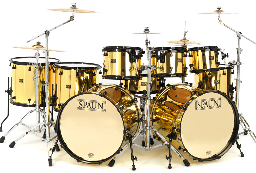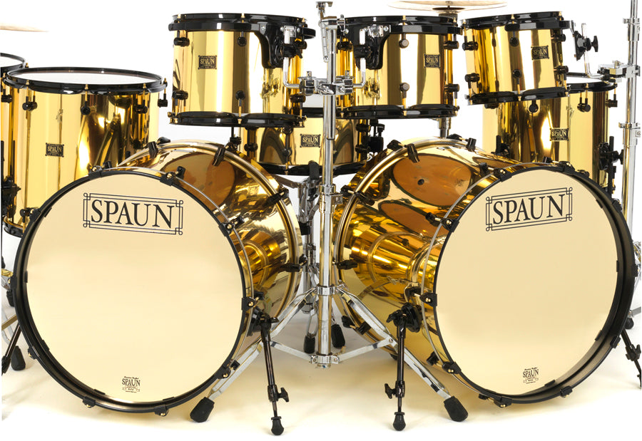 Shell Pack- 8x10 rack tom, 9x12 rack tom, 10x13 rack tom, 14x14 floor tom, 16x16 floor tom, 16x18 floor tom, two 18x22 kick drums. Mirror Gold with Black Hardware. Features our SBR Solid Brass Resonator Lugs, Double 45 Degree Edges, SSS Mounts on Rack Toms, and 100% Maple Shells.