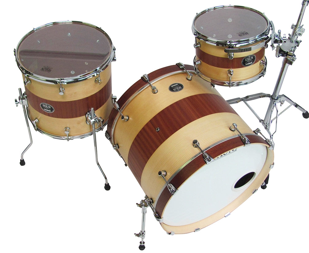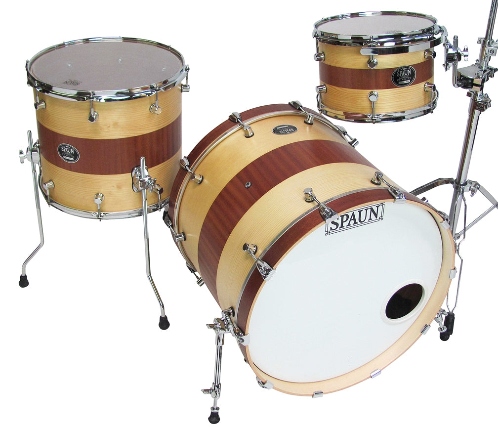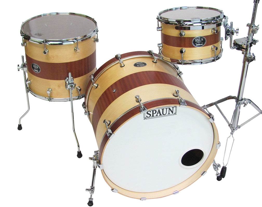 Shell Pack- 8x12 rack tom, 14x16 floor tom, 18x22 kick drum. Beautiful Natural Satin Lacquer Finish over Spruce with Mahogany Stripes and Chrome Hardware. Features our proprietary SBR Solid Brass Resonator Lugs, Double 45 Degree Edges, SSS Mounts on Rack Toms.