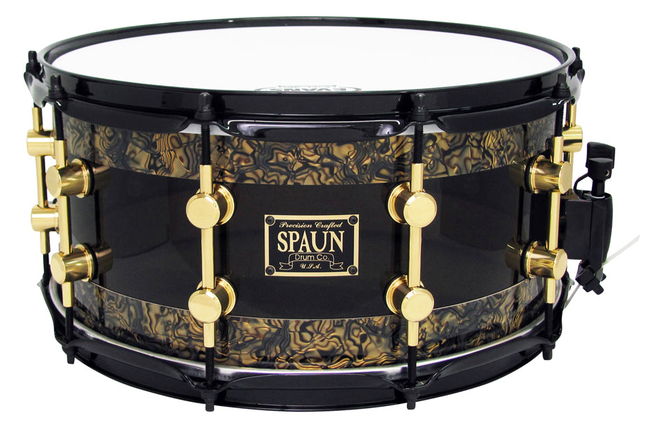 Features our 100% Maple & Acrylic Hybrid Shell, Proprietary SBR Solid Brass Resonator Lugs, Double 45 Degree Bearing Edges, and Hyper-Sensitive Snare Bed. Smoke Acrylic Center with Gold Abalone Edges, Gold Lugs and Black Hardware.
