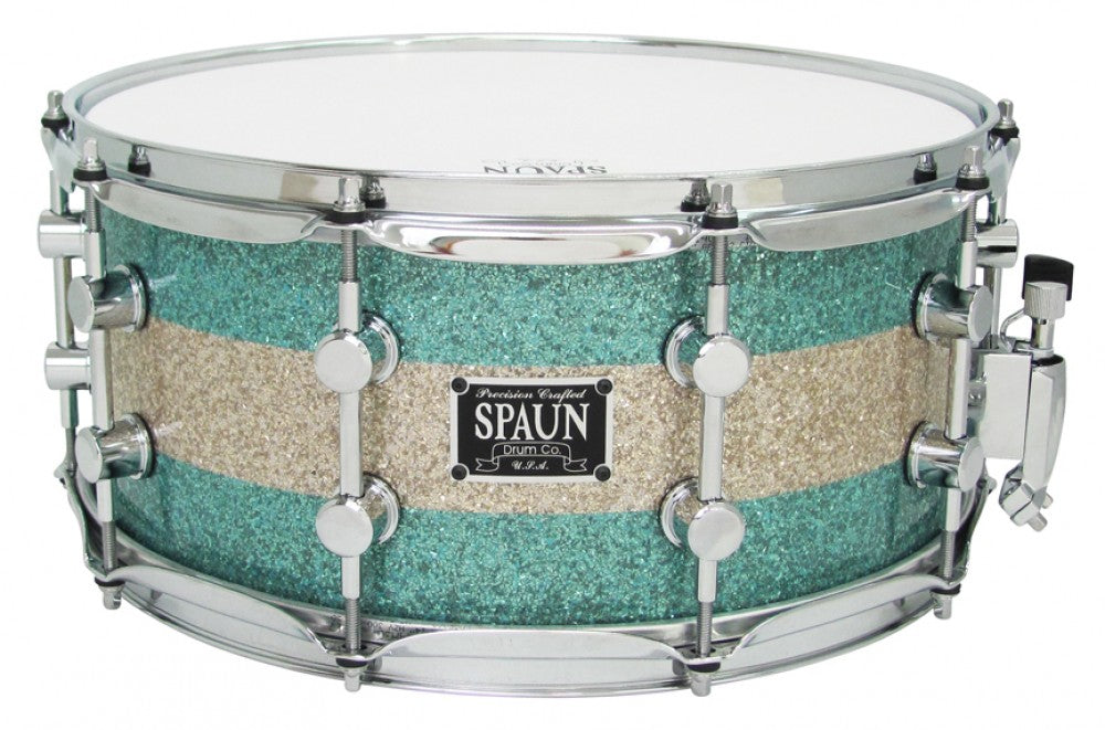 Features our 100% 8-ply Maple Shell, SBR Solid Brass Resonator Lugs, Double 45 Degree Bearing Edges, and Hyper-Sensitive Snare Bed. Baby Blue Glass with Silver Glass Center Stripe and Chrome Hardware.
