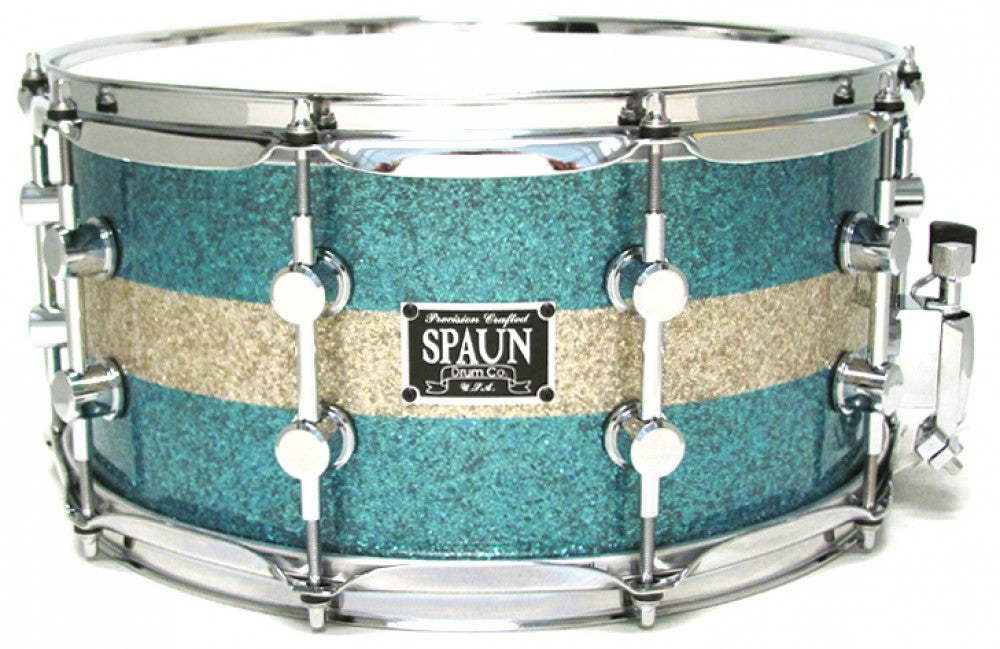 Features our 100% 8-ply Maple Shell, SBR Solid Brass Resonator Lugs, Double 45 Degree Bearing Edges, and Hyper-Sensitive Snare Bed. Baby Blue Glass with Silver Glass Center Stripe and Chrome Hardware.