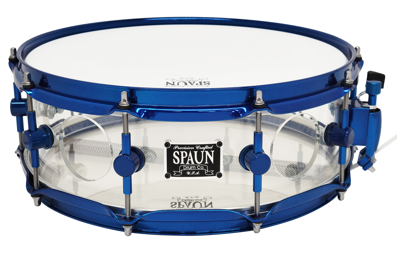 This killer Spaun snare features our Clear Acrylic Shell with Two Vents, proprietary SBR Solid Brass Resonator Lugs, Double 45 Degree Edges, Hyper-Sensitive Snare Bed, and Candy Blue Hardware